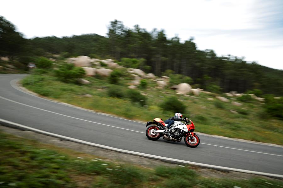 Yamaha XSR900: The un-faired retro machine that the GP is based upon, comes equipped with the same engine, but a tweaked chassis and riding position, for a more laid back style.