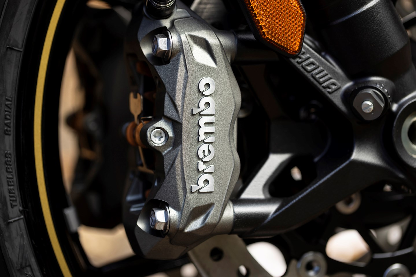 Front brake 300mm discs with four piston radial monobloc Brembo calipers. Cornering ABS
