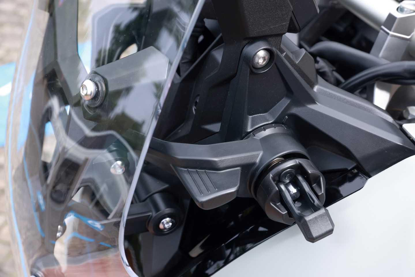 The X-ADV’s adjustable screen is now operable by the left hand only – previously, it needed two hands to move up or down, meaning it was only practical at standstill. Now, a simple clip frees the screen, and a knob lifts it up or down. The size of the screen remains the same, as does its range of adjustment (139mm up and down, 11° change in angle) – in use, the system works well and although the X-ADV’s sibling Forza 750 has a new electric screen for 2025, in practice it’s quicker and easier to use the X-ADV’s manual set-up.